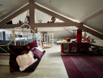 Elle se compose d’une cuisine entièrement équipée de marque NOLTE, d’un salon chaleureux avec poêle à bois, ainsi que de quatre chambres dont une avec placard, une avec salle d’eau et une avec un accès au grenier aménagé.