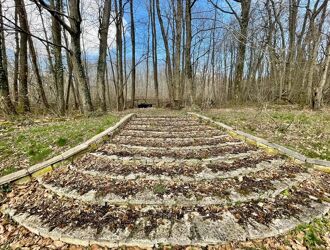 Cour pavée à l’avant de la maison.