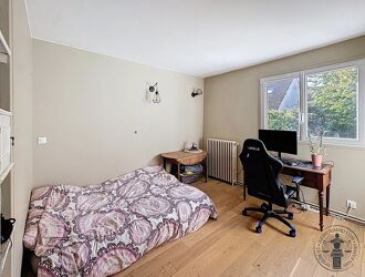 À l’étage, vous retrouvez : deux chambres, un bureau/dressing, salle de bains avec WC.