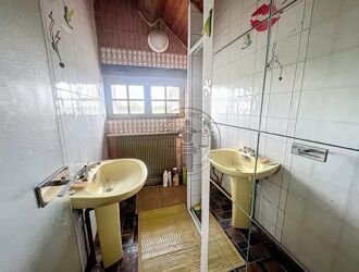 À l’étage, un vaste palier dessert deux belles chambres dont une pouvant aisément être séparée en deux, une seconde salle de bains et des toilettes.